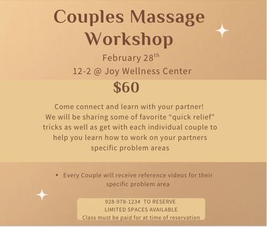 Come connect and learn with your partner! We will be sharing some of our favorite "quick relief" tricks as well as get with each individual couple to help you learn how to work on your partners specific problem areas.