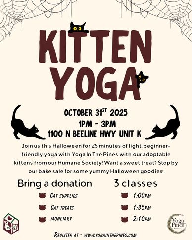 Don’t miss this purrfectly spooky chance to celebrate Halloween with yoga, kittens, and community! You can also come by the studio to just buy a treat or see/ adopt the kittens. Must register to participate in a kitten yoga session.