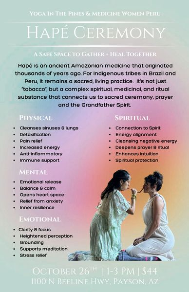 Join Us In Community Healing Hapé is an ancient Amazonian medicine that originated thousands of years ago. For Indigenous tribes in Brazil and Peru, it remains a sacred, living practice. It's not just “tobacco”, but a complex spiritual, medicinal, and ritual substance that connects us to sacred ceremony, prayer and the Grandfather Spirit.