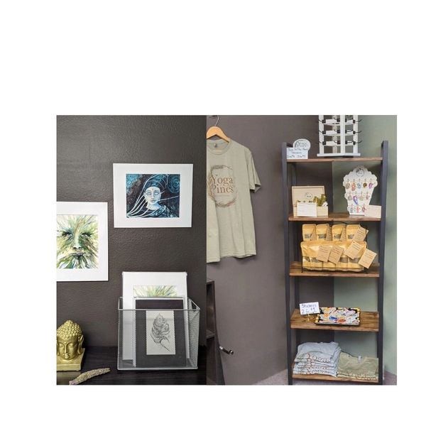 Our in-studio mini botique features merchandise created by local individuals. Including some of our members and teachers! Come find your locally made jewelry, loose leaf teas, art, smudge bundles, and more. We have locally printed Yoga In The Pines merch; shirts, hoodies and more!